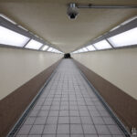 奥に伸びるアーケード街の入り口には、高層マンションが上に伸びています。
