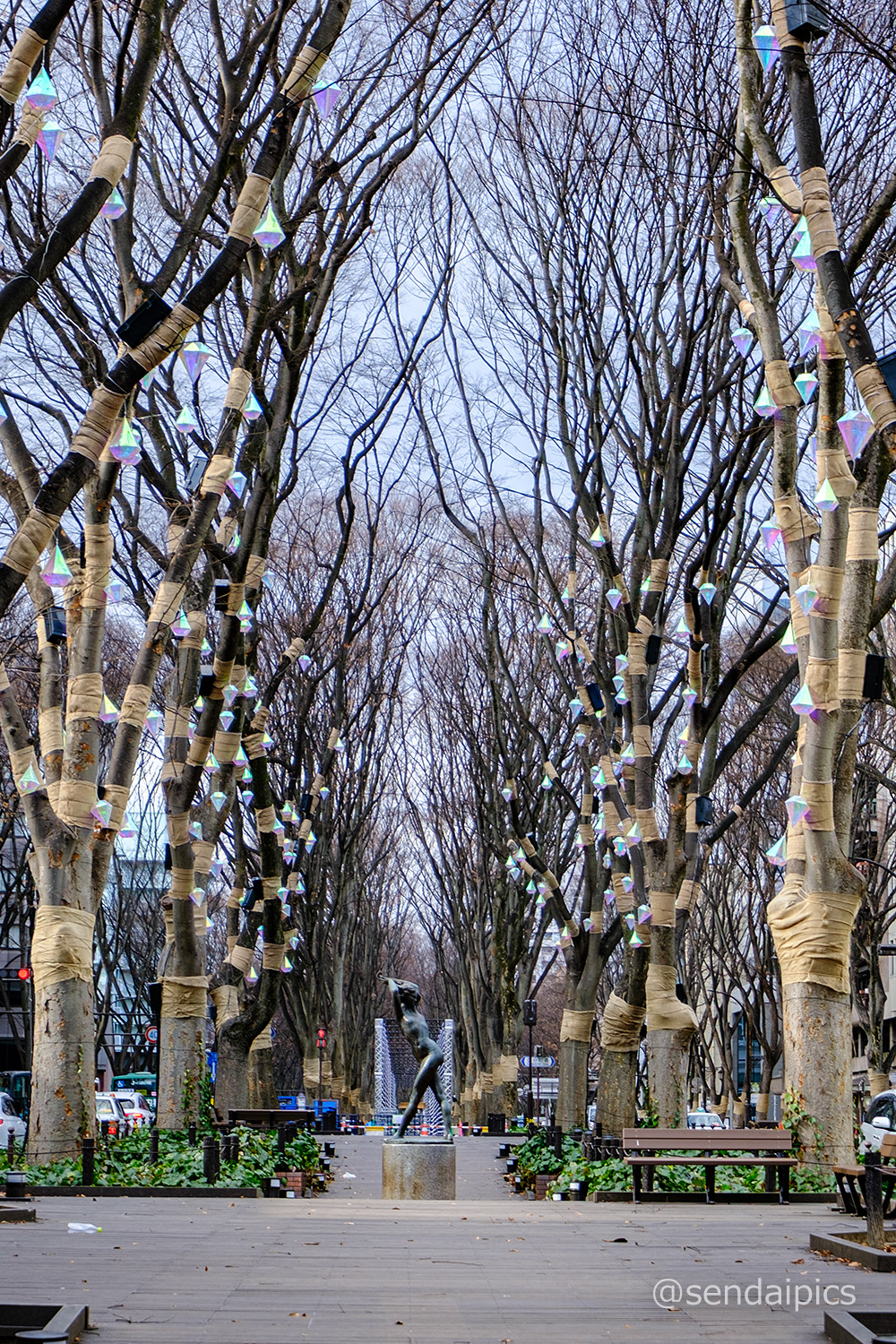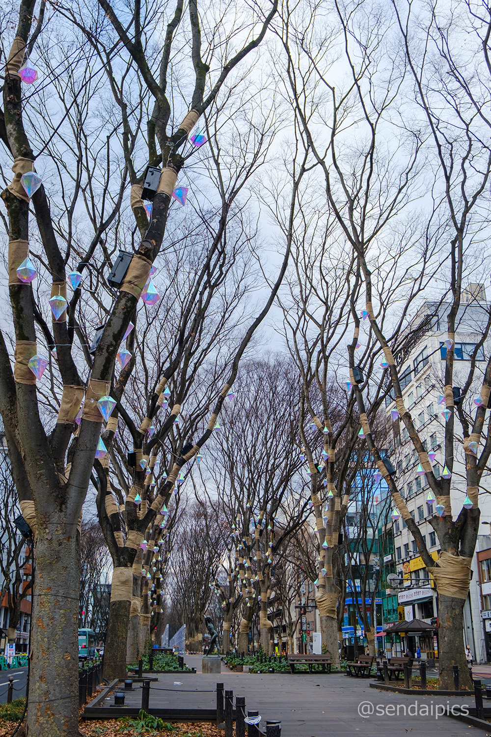 今度の月曜日から始まる新たなイルミネーション、SENDAI Bright-Nights STORYの飾り付けが定禅寺通で進んでいました。夜になって光が灯ったら、どんな感じになるんでしょうね。